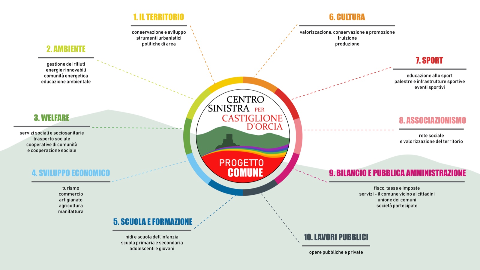 Per noi la buona politica ha radici antiche e si fonda sugli ideali della Resistenza e sui principi della Costituzione Italiana. Per noi la buona politica è mettere al centro la persona e il benessere dell’intera comunità, non lasciando nessuno indietro. Per queste ragioni presteremo attenzione alle esigenze di tutti i cittadini, dai più piccoli ai più anziani, risponderemo ai bisogni dei più fragili e alle necessità dei giovani, sosterremo chi fa impresa e il mondo del volontariato, noi crediamo nel valore della scuola e dell’educazione, dello sport e della cultura. Vogliamo un Comune che cura sé stesso ma allo stesso tempo guarda al di fuori dei suoi confini con spirito collaborativo.